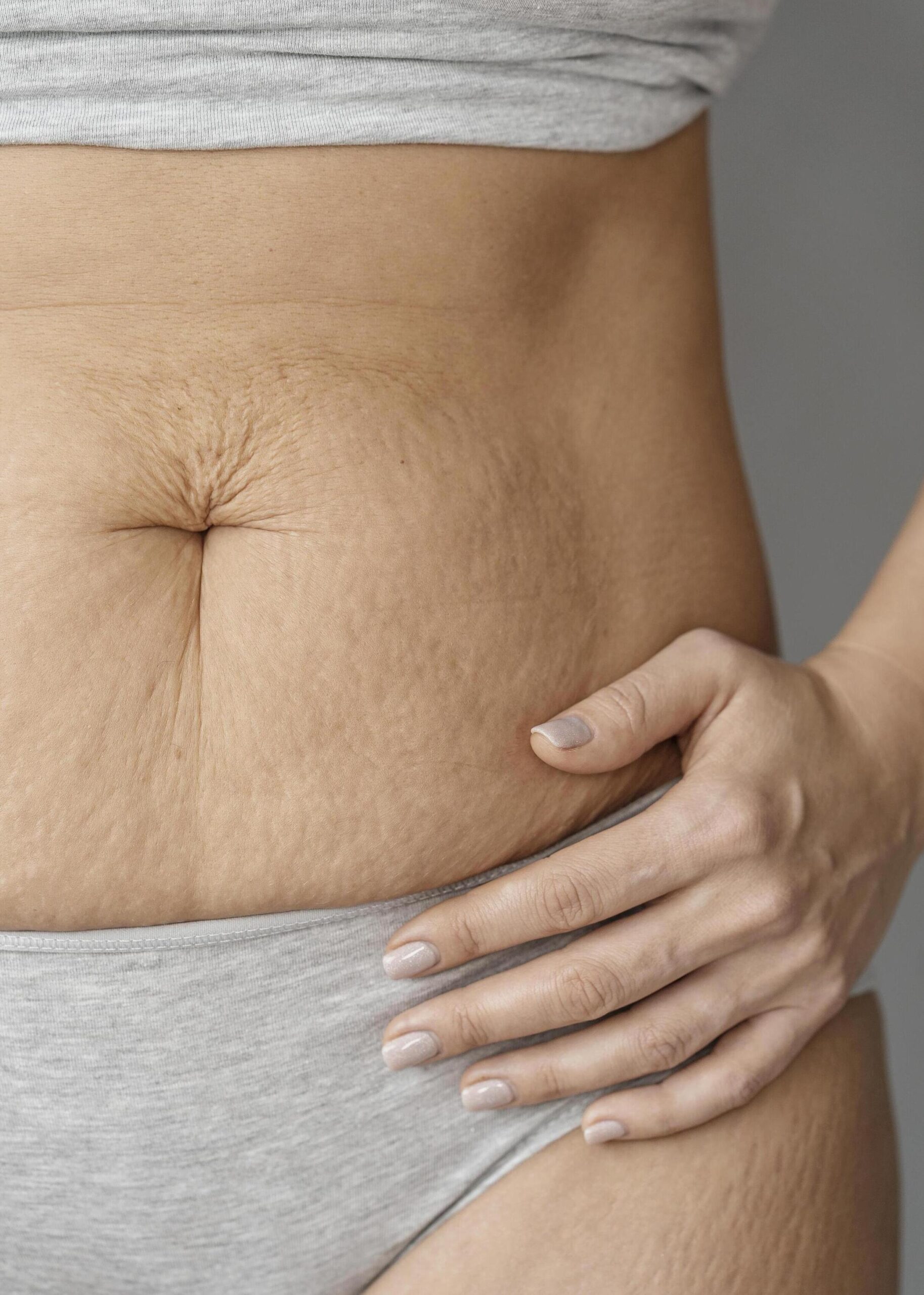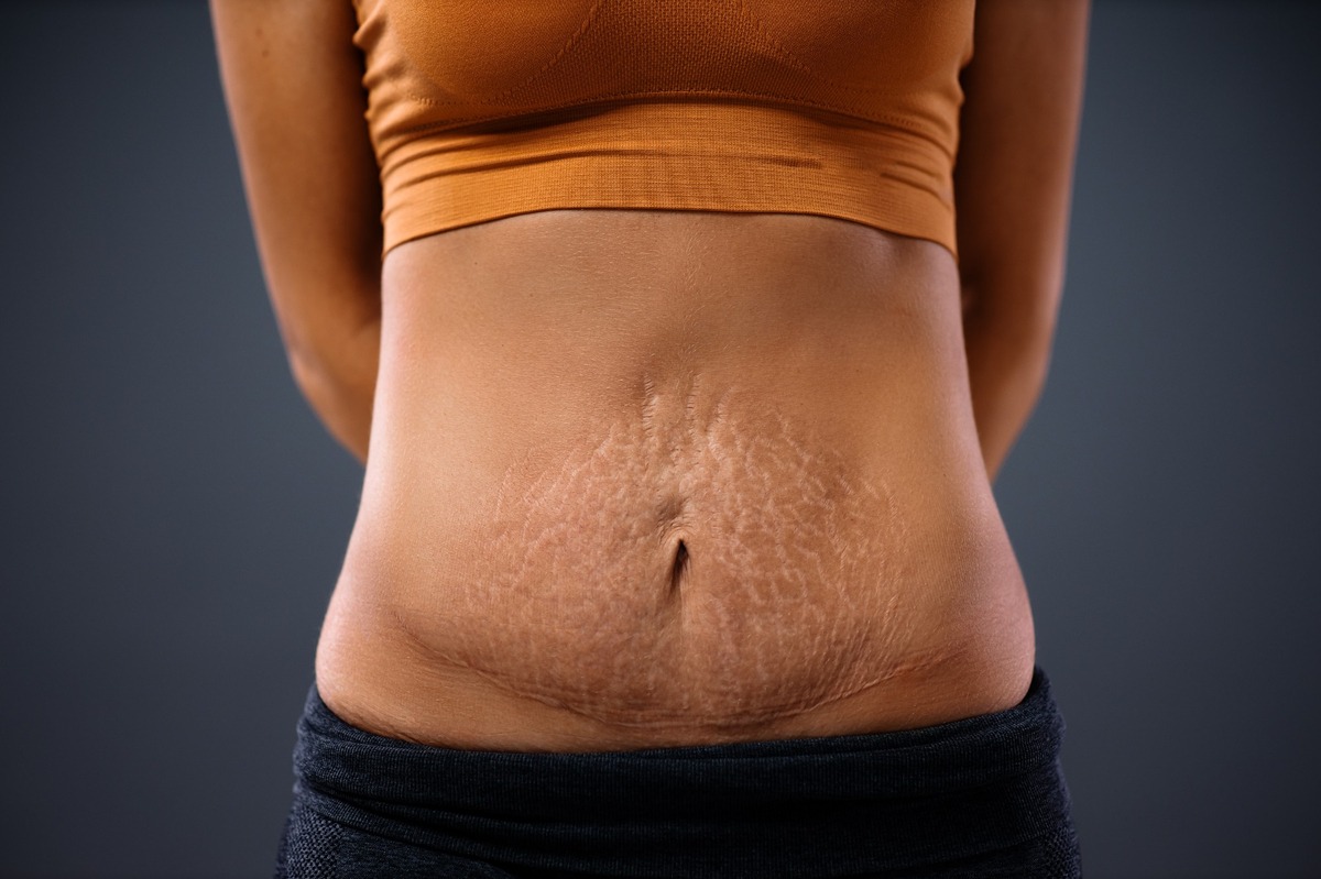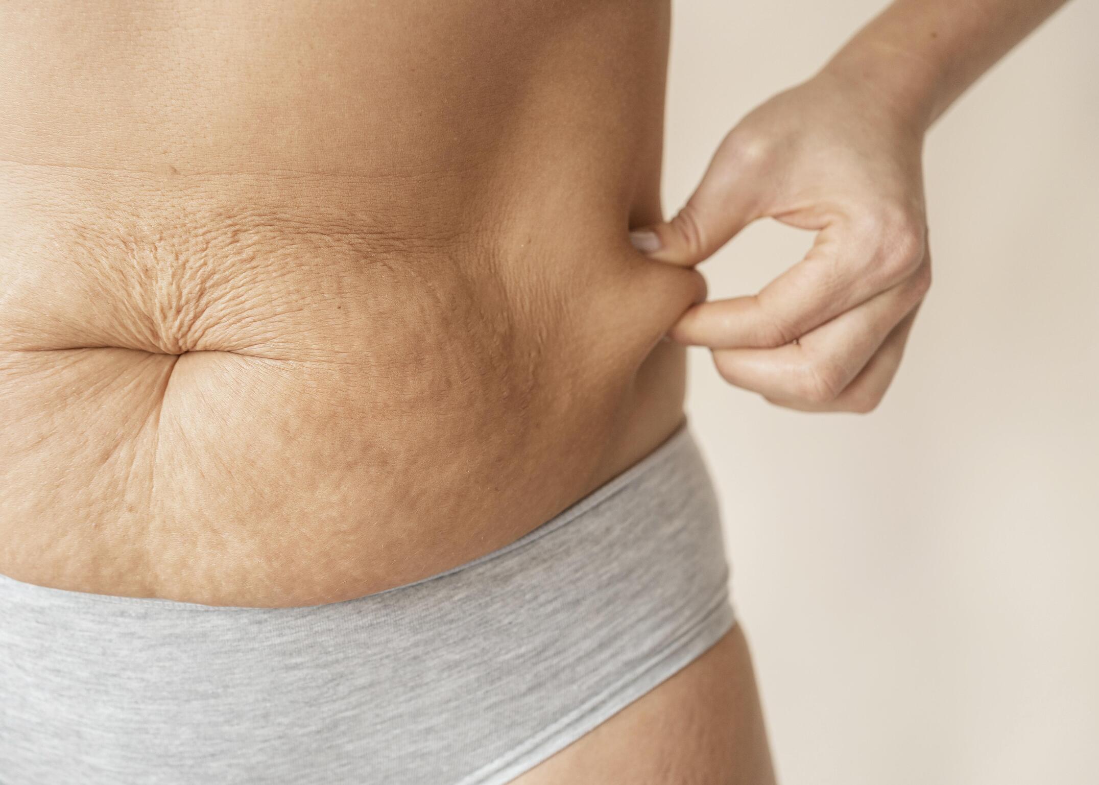 Wenn die Haut aufgrund einer Schwangerschaft oder Gewichtsabnahme zuerst gedehnt und nachher geschrumpft wird, kommt es zu Dehnungsstreifen.